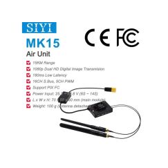 MK15 Hava Ünitesi Teknik Özellikler Sinyal Çıkışı: 16 kanal S.BUS, 5 kanal PWM Arayüzü ve Bağlantı Noktaları: - SBUS: 3-Pin - Veri bağlantısı (FC'ye): UART 4-Pin - PWM Kanalı 1 ila 5: 6 Pimli - Video Girişi: Ethernet 8 Pimli - Donanım Yazılımı Yükseltmesi: Type-C Boyutlar (anten hariç): 70 x 55 x 16 mm Ağırlık (anten hariç): 100 g